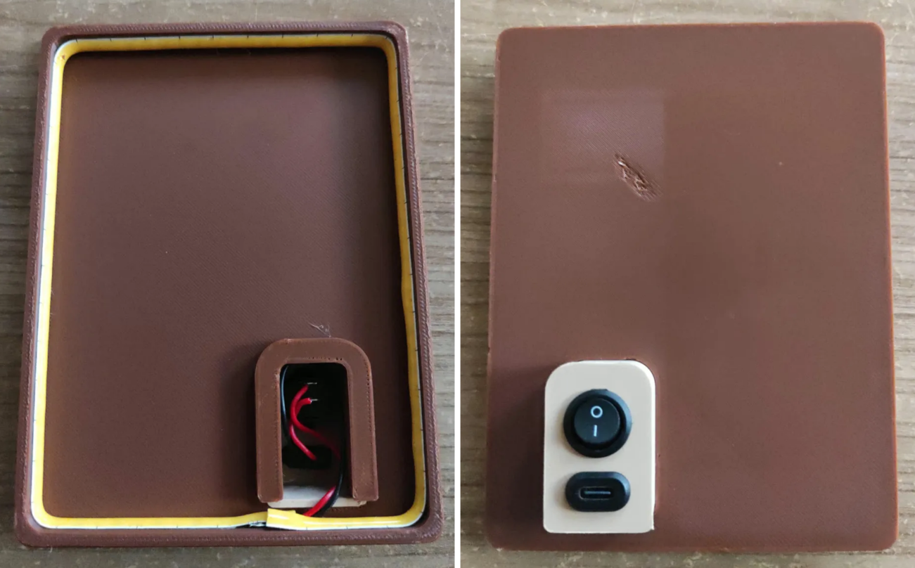 - The design now includes a slot into which a switch can be mounted. The switch slot, along with a slot for a UCB-C port are both present on a small separate back-piece which is “press-mounted” into the back section of the frame.