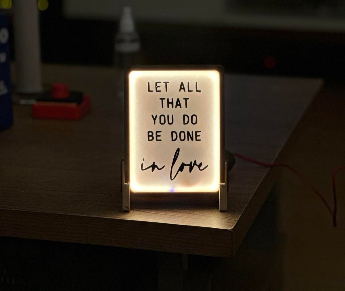 Figure 13 shows the assembled lamp in use. All in all, I think the result did not turn out bad at all. I really like the fact that it does not require any additional tools or components to be assembled. Its ease of print has been a godsend after the umpteenth hour of printing. Furthermore, its modularity allows for the front panel to be easily switched for a custom design. Finally, tweaking the model into landscape mode in addition to the portrait mode design I had decided on was straight forward. Figure 14 shows some of the different front panels I made using online lithophane generators. I have also uploaded the designs to my Printables profile.