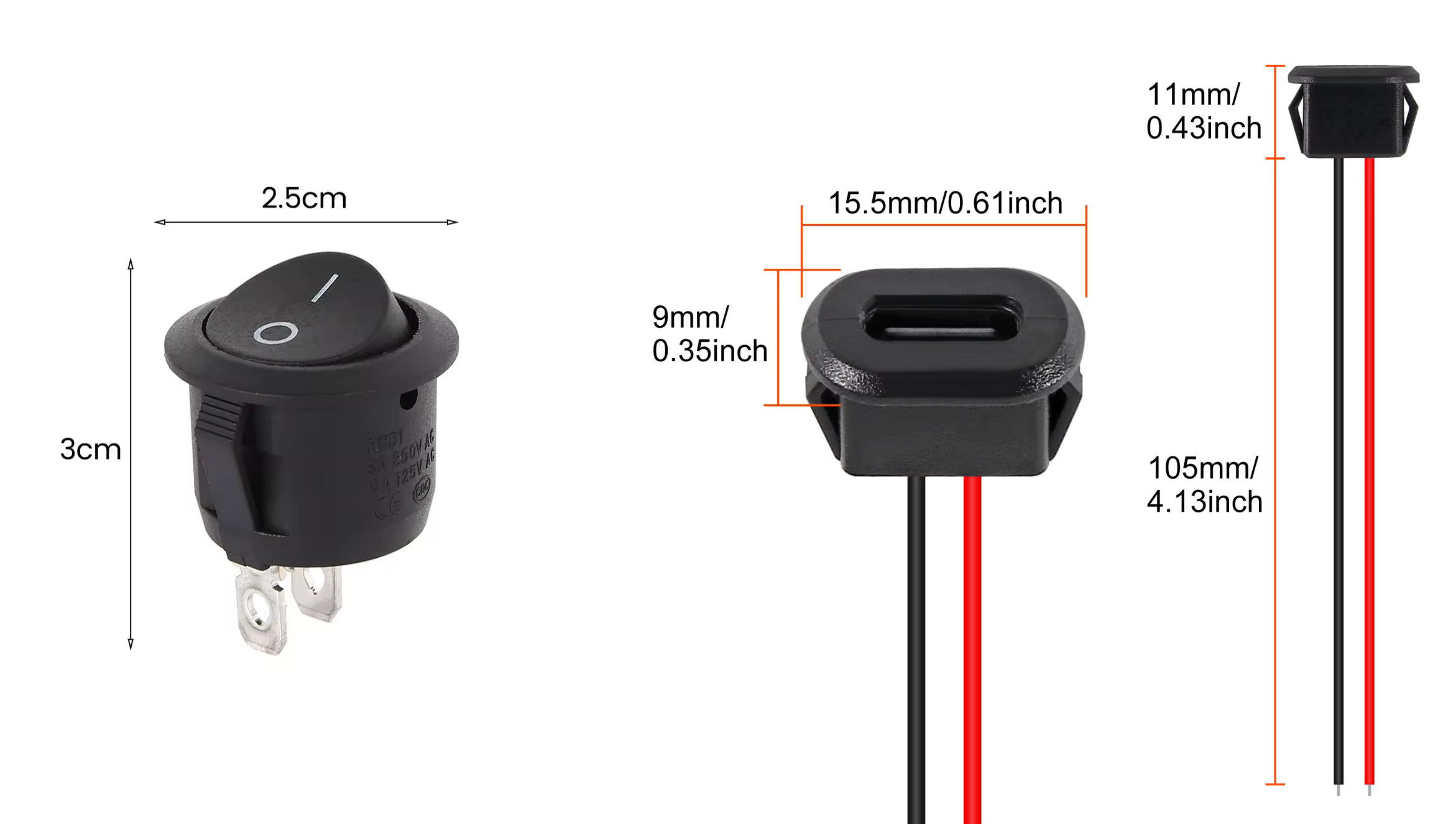 I have yet to mention anything about the electronics. I am not sure if there is a standard size for either the kind of electric switch or UCB-C port I ended up using. My choice was simply motivated by availability. At first I went on Amazon, but was quickly chased away but the high pricing (especially considering I was looking at ordering a hundred units of each). Looking into AliExpress yielded much cheaper results (including shipping). Figure 11 shows the dimensions of both components. I would have attached a link to the seller I used for my order, however, it seems their shop is no longer available on AliExpress.