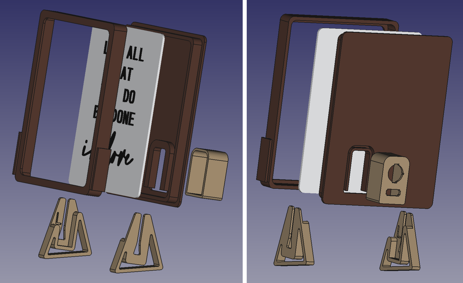 15°tilt angle, making the frame much more comfortable to look at. - No screws, clips or similar components are required for the assembly. The front plate along with the back section of the frame slide into the front section. Due to the intentional lack of tolerances in my design, this assembly is on its own sturdy enough. Finally, sliding the feet into the assembly locks the back and front sections of the frame into each other making the final build very sturdy.