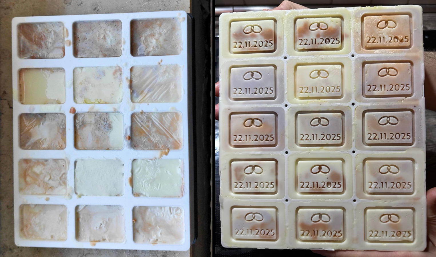 Figure 8 shows the tray in use: On the left is a top view of the mold after being filled with melted soap. On the right is a view of the hardened bars of soap after removing the bottom plate. During the first use of the mold, removing the bottom plate was quite hard as the soap was sticking to both parts of the mold. After a lot of persistence I was able to take the mold apart. However, it took me the best part of 10 minutes to do so, and by the end my fingers were very sore: There was no way I was going to repeat this process nine more times. Thankfully, after some googling I stumbled across the suggestion of oiling the mold before pouring soap into it. I was skeptical at first as I was scared I would end up with greasy soap bars, thankfully that ended up not being the case, and using oil ended up making the mold disassembly much easier.
